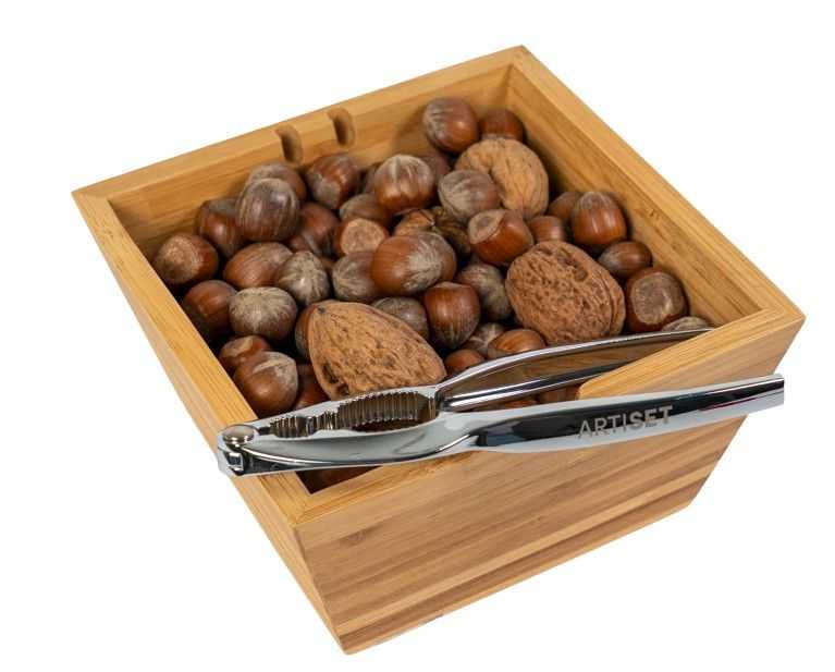 Ideen-Nr. 635565Nussknacker Set. Dieses hochwertige Nussknacker Set ist ein stilvoller Werbeartikel und ein beliebtes Geschenk für Kunden, Mitarbeitende oder Geschäftspartner. Die formschöne Bambusschale verfügt über eine integrierte Auflagefläche für den Metallnussknacker und überzeugt durch ihre natürliche, wertige Optik. Der Nussknacker wird mit der Gravur deines Logos veredelt und macht deine Werbebotschaft dauerhaft sichtbar. Die Nussschale ist gefüllt mit einer hochwertigen Mischung aus 250 g Haselnüssen und 200 g Baumnüssen und bietet damit echten Genuss mit Mehrwert. Der Nussknacker wird passgenau in der Schale eingelegt, anschließend eingeschrumpft und in dekorative Geschenkfolie verpackt. Eine integrierte Schlaufe sorgt für eine ansprechende Präsentation und macht das Set ideal als Give-away, Weihnachtsgeschenk oder hochwertiger Werbeartikel.