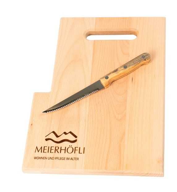 Ideen-Nr. 635692Schneidebrett aus Buche. Dieses Schneidebrett aus hochwertigem Buchenholz ist ein praktischer Alltagshelfer in jeder Küche. Mit dem integrierten Messer mit Holzgriff hast du alles griffbereit – ideal zum Schneiden, Zubereiten und Servieren. Die kompakte Grösse von 30,5 x 23 x 1,9 cm bietet genügend Fläche, ohne viel Platz zu beanspruchen. Das robuste Holz sorgt für Langlebigkeit und eine natürliche, hochwertige Optik. Durch die Lasergravur auf einer Position wird dein Logo oder deine Werbebotschaft präzise und dauerhaft auf dem Schneidebrett verewigt. Ein Werbeartikel mit echtem Nutzen – perfekt für Küche, Haushalt und als stilvolles Kundengeschenk, das regelmässig im Einsatz ist.