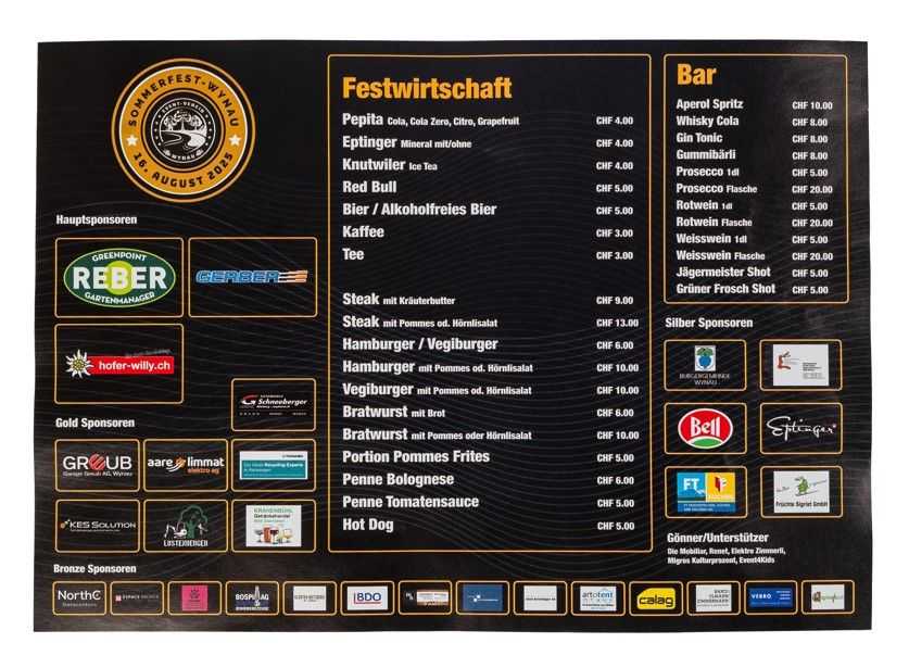 Ideen-Nr. 635554Tischset DIN A3. Dieses individuell bedruckbare Tischset im Format DIN A3 (420 x 297 mm quer) ist die perfekte Kombination aus Funktionalität und Werbewirkung. Aus robustem Affichenpapier (120 g/m²) gefertigt, ist es lichtundurchlässig und nassfest – ideal für Gastronomie, Events, Messen oder Kundenaktionen. Ob mit Menü, Spiel, Quiz oder deiner Werbebotschaft: Der 4-farbige Druck auf der gesamten Fläche sorgt für maximale Sichtbarkeit am Tisch. Bitte beachte, dass Material und Druckfarben nicht lebensmittelecht sind – das Tischset dient als Unterlage, nicht als Kontaktfläche für Speisen. Nutze die Zeit, in der deine Zielgruppe am Tisch sitzt – für Werbung, die hängen bleibt.