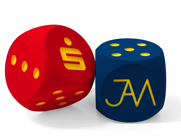 Ideen-Nr. 412973Schaumstoffwürfel mit ausgefrästem Werbelogo - Ausgefräste Würfelaugen 1 - 5 und ausgefrästes Logo auf einer Seite.
