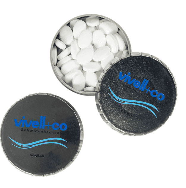 Ideen-Nr. 635480Diese runde Metalldose mit praktischem Springdeckel bringt frischen Wind in deinen Werbeauftritt. Gefüllt mit extra starken, zuckerfreien Pfefferminztabletten aus Schweizer Herstellung sorgt sie für einen kühlen Kopf – bei dir und deinen Kunden. Mit ihrem kompakten Format (ca. 22 mm hoch, Ø 76 mm) passt die silberne Dose perfekt in jede Tasche. Der Deckel wird im hochwertigen Digitaldruck individuell nach deinem Wunschdesign veredelt – damit dein Logo bei jedem Griff zur Minze sichtbar ist. Ideal als Streuartikel, Give-away oder kleiner Frischekick bei Meetings, Events oder im Büro. Die Pfefferminztabletten sind oval, weiss, stark im Geschmack und bei richtiger Lagerung mindestens 24 Monate haltbar.